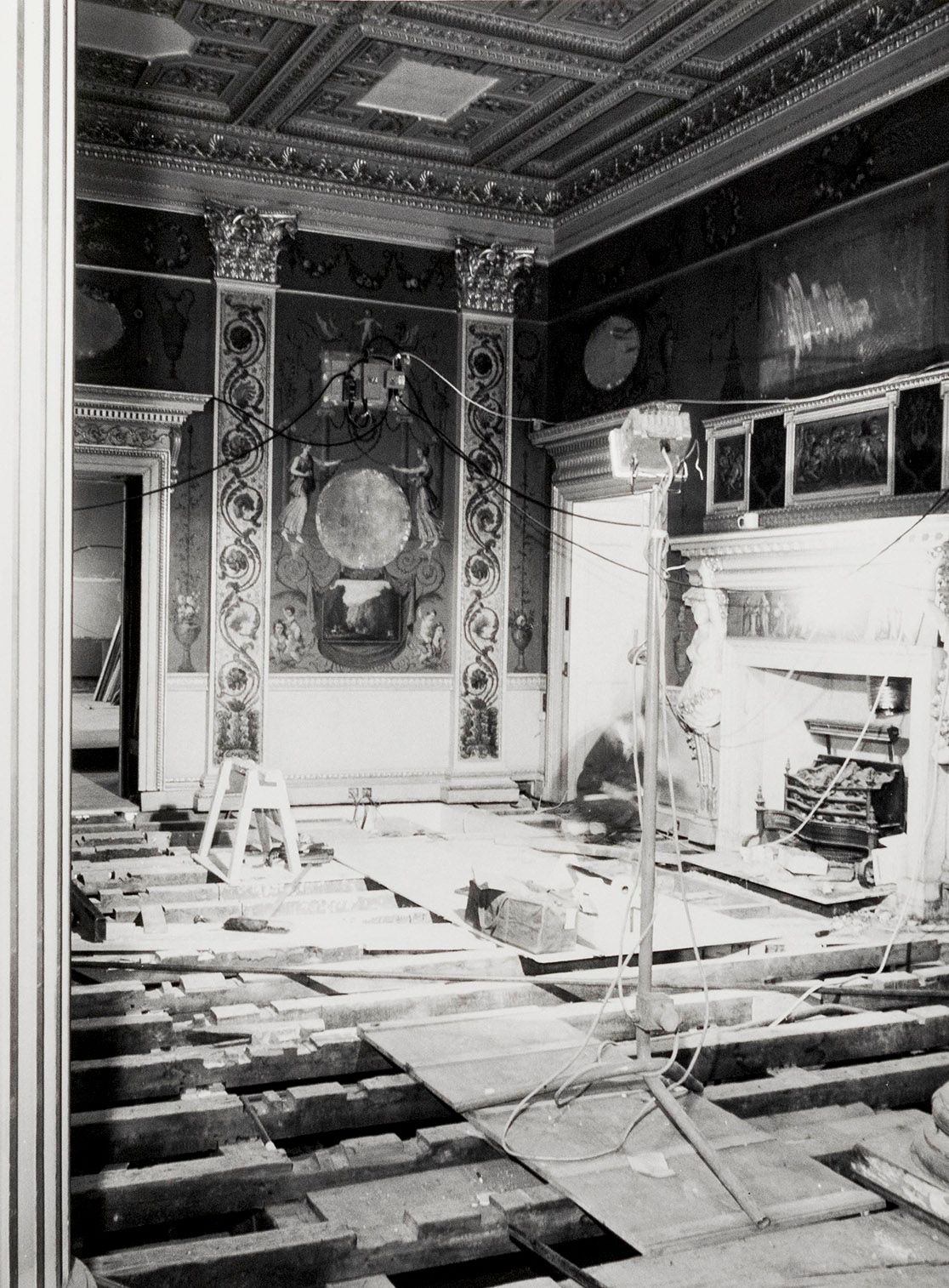 The room was badly damaged during the Second World War when a bomb hit neighbouring Bridgewater House. The shock of the impact brought most of the ceiling down and what is seen today is the result of restoration in the 1950s. Fortunately, the original painted panels had been put into storage for safekeeping and those at least could be reinstated.